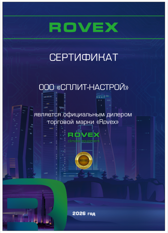 3 года гарантия от производителя ROVEX. 3 года сервисная гарантия от климатической компании Сплит-Настрой.